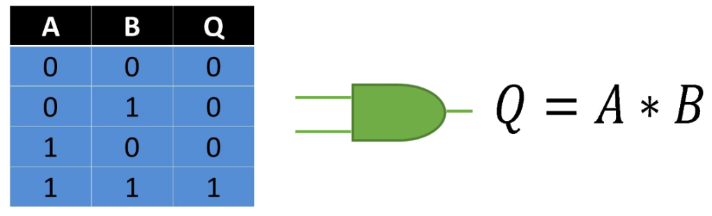 Esta compuerta también conocida como «todo o nada» tiene dos entradas y está representada por una multiplicación en el Álgebra de Boole. Ya que para obtener a la salida un 1 binario es necesario que sus dos entradas se encuentren en un estado binario 1, si por ejemplo falta alguna de sus entradas o una de ellas no representa un estado binario 1 a su salida siempre se encontrará en estado binario 0.