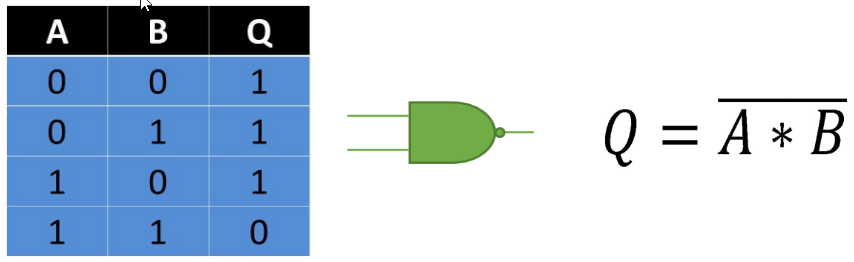 También conocida como AND conjugada o invertida. Como su nombre lo indica funciona de forma contraria a la compuerta AND lo que quiere decir que para obtener a la salida un estado binario 0 es necesario que sus entradas se encuentren en un estado binario 1.