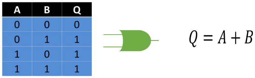 Esta compuerta posee dos entradas y esta representada en el Algebra de Boole como una suma. Esta compuerta al contrario de la AND permite mostrar a la salida un estado binario 1 solo requiriendo que una de sus dos entradas se encuentren en un estado binario 1, lo que quiere decir que para mostrar un estado binario 0 las dos entradas tienen que encontrarse en estado binario 0.