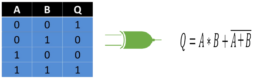 Este posee el mismo funcionamiento que la compuerta X-OR solo que funciona de forma invertida por lo que si las entradas son iguales la salida dará un estado binario de 1, por lo que si las entradas son diferentes el estado binario de salida será 0.