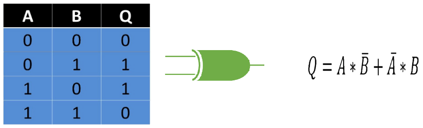 También llamada suma exclusiva posee dos entradas y una forma sencilla de entender su funcionamiento es que al tomar las entradas valores idénticos el estado binario de salida será 0 y al tomar entradas con valores diferentes su estado binario de salida sera 1.