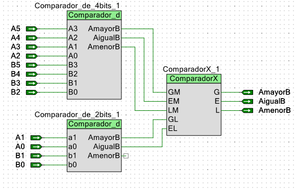 Ahora con el comparador de 4 bits y 2 bits realizamos el comparador de 6 bits: