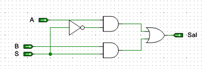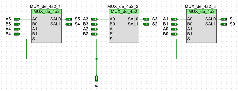 Después diseñamos los multiplexores de 12 a 6 ya que para generar la resta cuando A < B tendremos que cambiar los selectores del multiplexor para poder generar la resta y poder observar la resta con números negativos.