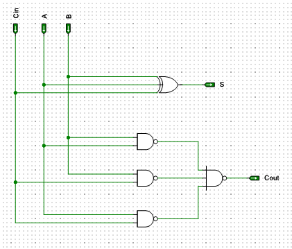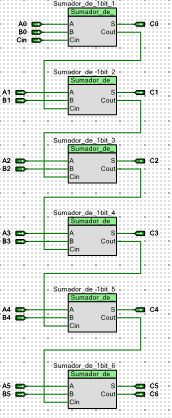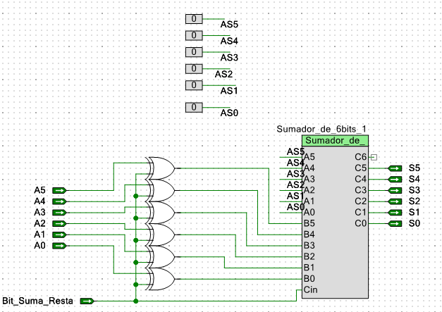 Como se observa si está en 1 el bit de Suma/Resta el complemento a 2 funcionará, en caso de que no a la salida tendremos el mismo número en cual sumaremos con un sumador de 6 bits que diseñaremos a partir de un sumador completo de 1 bit.