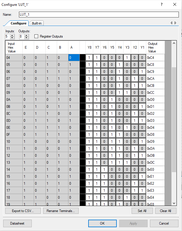 Después diseñamos por medio del circuito 74LS185 el convertidor de 7 bits de binario a BCD. Primero diseñamos el circuito del 74LS185 por medio del LUT que posee el software Psoc Creator: