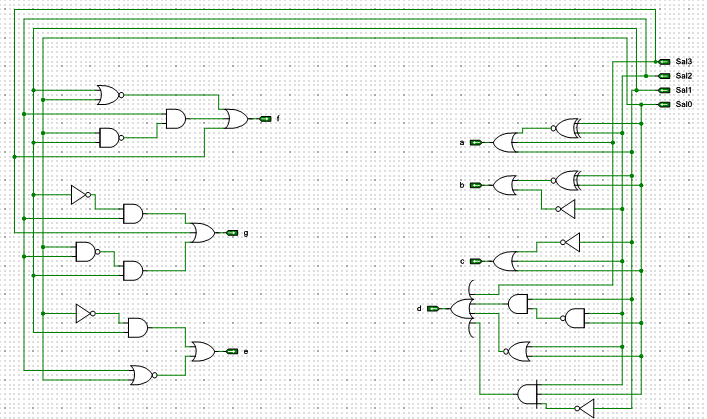 Después haremos un decodificador de BCD a 7 segmentos con puertas NAND y NOR y un ENABLE para poder variar la visualización por medio del contador de 2 bits: