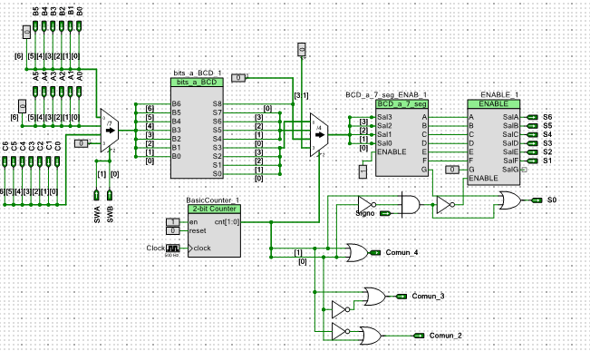 Ya que solo tenemos un display 7 segmentos de 4 dígitos podemos observar que necesitamos mas displays para poder visualizar lo que se nos pide para esta práctica, como conseguir otro display no es posible lo que hacemos es multiplexar la visualización por medio del MUX de 28 a 7 y el MUX de 16 a 4. Ya que vamos a multiplexar los datos de la Memoria A, los datos de la Memoria B y el resultado de la suma y la resta, también necesitamos multiplexar el display 7 segmentos de 4 dígitos ya que este posee la misma salida para los 4 dígitos del display por lo que con un contador de 2 bits y una configuración para que los diferentes comunes del display están variando se monta el siguiente circuito: